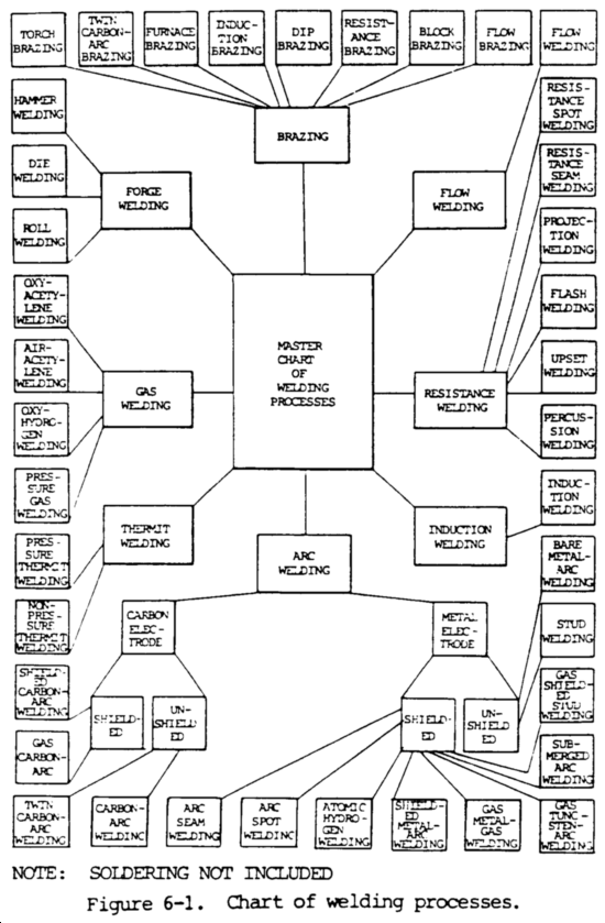 The purpose of this chapter is to outline the various techniques used in welding processes. Welding processes may be broken down into many categories. Various methods and materials may be used to accomplish good welding practices. Common methods of welding used in modern metal fabrication and repair are shown in figure 6-1.