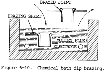 e. Dip Brazing. There are two methods of dip brazing: chemical bath and molten metal bath. In chemical bath dip brazing, the brazing fillermetal is preplaced and the assembly is immersed in a bath of molten salt, as shown in figure 6-10. The salt bath furnishes the heat necessary for brazing and usually provides the necessary protection from oxidation. The salt bath is contained in a metal or other suitable pot and heated. In molten metal bath dip brazing, the parts are immersed in a bath of molten brazing filler metal contained in a suitable pot. A cover of flux should be maintained over the molten bath to protect it from oxidation. Dip brazing is mainly used for joining small parts such as wires or narrow strips of metal. The ends of wires or parts must be held firmly together when removed from the bath until the brazing filler metal solidifies.