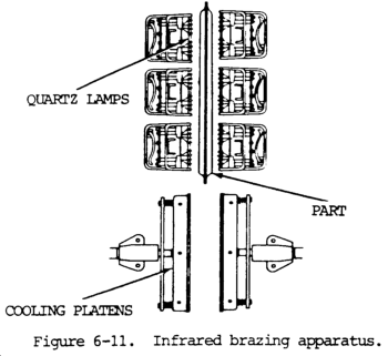 i. Infrared Brazing (IRB). Infared brazing uses a high intensity quartz lamp as a heat source. The process is suited to the brazing of very thin materials and is normally not used on sheets thicker than 0.50 in. (1.27 cm). brazed are supported in a position which enables radiant energy to be focused on the joint. The assembly and the lamps can be placed in an evacuated or controlled atmosphere. Figure 6-11 illustrates the equipment used for infrared brazing.