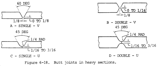b. The square butt joints shown in figure 6-16 are used for butt welding light sheet metal. Plate thicknesses 3/8 to 1/2 in. (0.95 to 1.27 cm) can be welded using the single V or single U joints as shown in views A and C, figure 6-18. The edges of heavier sections (1/2 to 2 in. (1.27 to 5.08 cm)) are prepared as shown in view B, figure 6-18. Thickness of 3/4 in. (1.91 cm) and up are prepared as shown in view D, figure 6-18. The edges of heavier sections should be prepared as shown in views B and D, figure 6-18. The single U groove (view C, fig. 6-18) is more satisfactory and requires less filler metal than the single V groove when welding heavy sections and when welding in deep grooves. The double V groove joint requires approximately one-half the amount of filler metal used to produce the single V groove joint for the same plate thickness. In general, butt joints prepared from both sides permit easier welding, produce less distortion, and insure better weld metal qualities in heavy sections than joints prepared from one side only.
