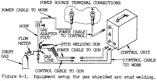 (1) Stud welding. The stud welding process produces a joining of metals by heating them with an arc drawn between a metal stud, or similar part, and the workpiece. The molten surfaces to be joined, when properly heated, are forced together under pressure. No shielding gas is used. The most common materials welded with the arc stud weld process are low carbon steel, stainless steel, and aluminum. Figure 6-2 shows a typical equipment setup for arc stud welding.