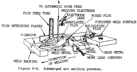(3) Submerged arc welding. This process joins metals by heating them with an arc maintained between a bare metal electrode and the workpiece. The arc is shielded by a blanket of granular fusible material and the workpiece. Pressure is not used and filler metal is obtained from the electrode or from a supplementary welding rod. Submerged arc welding is distinguished from other arc welding processes by the granular material that covers the welding area. This granular material is called a flux, although it performs several other important functions. It is responsible for the high deposition rates and weld quality that characterize the submerged arc welding process in joining and surfacing applications. Basically, in submerged arc welding, the end of a continuous bare wire electrode is inserted into a mound of flux that covers the area or joint to be welded. An arc is initiated, causing the base metal, electrode, and flux in the immediate vicinity to melt. The electrode is advanced in the direction of welding and mechanically fed into the arc, while flux is steadily added. The melted base metal and filler metal flow together to form a molten pool in the joint. At the same time, the melted flux floats to the surface to form a protective slag cover. Figure 6-4 shows the submerged arc welding process.
