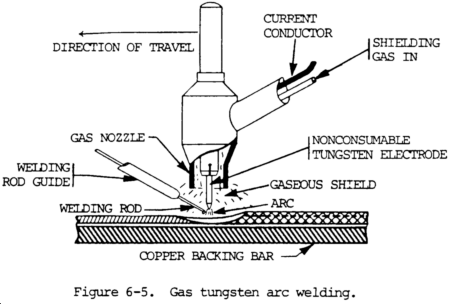 (4) Gas tungsten-arc welding (TIG welding or GTAW). The arc is drawn between a nonconsumable tungsten electrode and the workpiece. Shielding is obtained from an inert gas or gas mixture. Pressure and/or filler metal may or may not be used. The arc fuses the metal being welded as well as filler metal, if used. The shield gas protects the electrode and weld pool and provides the required arc characteristics. A variety of tungsten electrodes are used with the process. The electrode is normally ground to a point or truncated cone configuration to minimize arc wandering. The operation of typical gas shielded arc welding machines may be found in TM 5-3431-211-15 and TM 5-3431-313-15. Figure 6-5 shows the relative position of the torch, arc, tungsten electrode, gas shield, and the welding rod (wire) as it is being fed into the arc and weld pool.