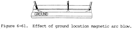 a. General. Arc blow is the deflection of an electric arc from its normal path due to magnetic forces. It is mainly encountered with dc welding of magnetic materials, such as steel, iron, and nickel, but can also be encountered when welding nonmagnetic materials. It will usually adversely affect appearance of the weld, cause excessive spatter, and can also impair the quality of the weld. It is often encountered when using the shielded metal arc welding process with covered electrodes. It is also a factor in semiautomatic and fully automatic arc welding processes. Direct current, flowing through the electrode and the base metal, sets up magnetic fields around the electrode, which deflect the arc from its intended path. The welding arc is usually deflected forward or backward of the direction of travel; however, it may be deflected from one side to the other. Back blow is encountered when welding toward the ground near the end of a joint or into a corner. Forward blow is encountered when welding away from the ground at the start of a joint. Arc blow can become so severe that it is impossible to make a satisfactory weld. Figure 6-61 shows the effect of ground location on magnetic arc blow.