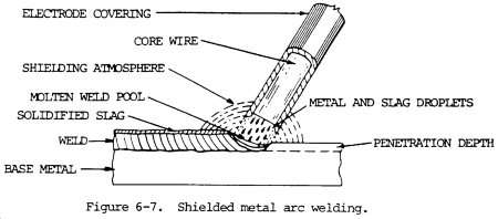 (6) Shielded metal-arc welding. The arc is drawn between a covered consumable metal electrode and workpiece. The electrode covering is a source of arc stabilizers, gases to exclude air, metals to alloy the weld, and slags to support and protect the weld. Shielding is obtained from the decomposition of the electrode covering. Pressure is not used and filler metal is obtained from the electrode. Shielded metal arc welding electrodes are available to weld carbon and low alloy steels; stainless steels; cast iron; aluminum, copper, and nickel, and their alloys. Figure 6-7 describes the shielded metal arc welding process.