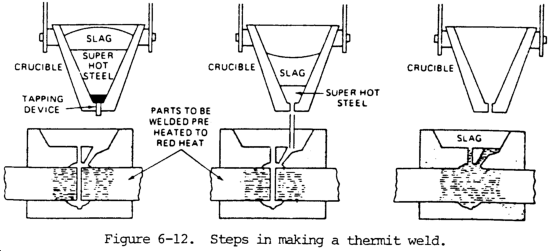 d. Themit welding utilizes gravity, which causes the molten metal to fill the cavity between the parts being welded. It is very similar to the foundry practice of pouring a casting. The difference is the extremely high temperature of the molten metal. The making of a thermit weld is shown in figure 6-12. When the filler metal has cooled, all unwanted excess metal may be removed by oxygen cutting, machining, or grinding. The surface of the completed weld is usually sufficiently smooth and contoured so that it does not require additional metal finishing. Information on thermit welding equipment may be found in Section V of Chapter 5.
