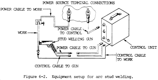 (1) Stud welding. The stud welding process produces a joining of metals by heating them with an arc drawn between a metal stud, or similar part, and the workpiece. The molten surfaces to be joined, when properly heated, are forced together under pressure. No shielding gas is used. The most common materials welded with the arc stud weld process are low carbon steel, stainless steel, and aluminum. Figure 6-2 shows a typical equipment setup for arc stud welding.