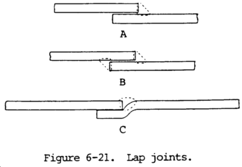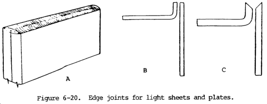 c. The closed corner joint (view B, fig. 6-19) is used on light sheet metal, usually 20 gage or less, and on lighter sheets when high strength is not required at the joint. In making the joint by oxyacetylene welding, the overlapping edge is melted down, and little or no filler metal is added. In arc welding, only a very light bead is required to make the joint. When the closed joint is used for heavy sections, the lapped plate is V beveled or U grooved to permit penetration to root of the joint.