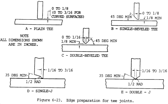 b. The square butt joints shown in figure 6-16 are used for butt welding light sheet metal. Plate thicknesses 3/8 to 1/2 in. (0.95 to 1.27 cm) can be welded using the single V or single U joints as shown in views A and C, figure 6-18. The edges of heavier sections (1/2 to 2 in. (1.27 to 5.08 cm)) are prepared as shown in view B, figure 6-18. Thickness of 3/4 in. (1.91 cm) and up are prepared as shown in view D, figure 6-18. The edges of heavier sections should be prepared as shown in views B and D, figure 6-18. The single U groove (view C, fig. 6-18) is more satisfactory and requires less filler metal than the single V groove when welding heavy sections and when welding in deep grooves. The double V groove joint requires approximately one-half the amount of filler metal used to produce the single V groove joint for the same plate thickness. In general, butt joints prepared from both sides permit easier welding, produce less distortion, and insure better weld metal qualities in heavy sections than joints prepared from one side only.