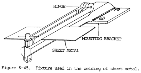 (5). The welding fixture can be a source of arc blow; therefore, an analysis with respect to fixturing is important. The hold-down clamps and backing bars must fit closely and tightly to the work. In general, copper or nonferrous metals should be used. Magnetic structure of the fixture can affect the magnetic forces controlling the arc.