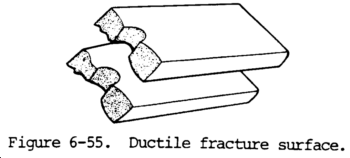 (1) Ductile fracture occurs by deformation of the crystals and slip relative to each other. There is a definite stretching or yielding and a reduction of cross-sectional area at the fracture (fig. 6-55).
