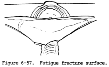 (2) The fracture surface of a fatigue failure is generally smooth and frequently shins concentric rings or areas spreading from the point where the crack initiated. These rings show the propagation of the crack, which might be related to periods of high stress followed by periods of inactivity. The fracture surface also tends to become rougher as the rate of propagation of the crack increases. Figure 6-57 shows the characteristic fatigue failure surface.