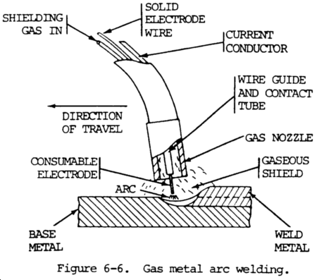 (5) Gas metal-arc Welding (MIG welding or GMAW). In this process, coalescence is produced by heating metals with an arc between a continuous filler metal (consumable) electrode and the workpiece. The arc, electrode tip and molten weld metal are shielded from the atmosphere by a gas. Shielding is obtained entirely from an externally supplied inert gas, gas mixture, or a mixture o f a gas and a flux. The electrode wire for MIG welding is continuously fed into the arc and deposited as weld metal. Electrodes used for MIG welding are quite small in diameter compared to those used in other types of welding. Wire diameters 0.05 to 0.06 in. (0.13 to 0.15 cm) are average. Because of the small sizes of the electrode and high currents used in MIG welding, the melting rates of the electrodes are very high. Electrodes must always be provided as long, continuous strands of tempered wire that can be fed continuously through the welding equipment. Since the small electrodes have a high surface-to-volume ratio, they should be clean and free of contaminants which may cause weld defects such as porosity and cracking. Figure 6-6 shows the gas metal arc welding process. All commercially important metals such as carbon steel, stainless steel, aluminum, and copper can be welded with this process in all positions by choosing the appropriate shielding gas, electrode, and welding conditions.