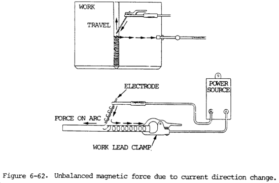 e. Except under the most simple conditions, the self-induced magnetic field is not symmetrical throughout the entire electric circuit and changes direction at the arc. There is always an unbalance of the magnetic field around the arc because the arc is roving and the current flow pattern through the base material is not constant. The magnetic flux will pass through a magnetic material such as steel much easier than it will pass through air, and the magnetic flux path will tend to stay within the steel and be more concentrated and stronger than in air. Welding cur-rent passes through the electrode lead, the electrode holder to the welding electrode, then through the arc into the base metal. At this point the current changes direction to pass to the work lead connection, then through the work lead back to the welding machine. This is shown by figure 6-62. At the point the arc is in contact with the work, the change of direction is relatively abrupt, and the fact that the lines of force are perpendicular to the path of the welding current creates a magnetic unbalance. The lines of force are concentrated together on the inside of the angle of the current path through the electrode and the work, and are spread out on the outside angle of this path. Consequently, the magnetic field is much stronger on the side of the arc toward the work lead connection than on the other side, which produces a force on the stronger side and deflects the arc to the left. This is toward the weaker force and is opposite the direction of the current path. The direction of this force is the same regardless of the direction of the current. If the welding current is reversed, the magnetic field is also reversed, but the direction of the magnetic force acting on the arc is always in the same direction, away from the path of the current through the work.