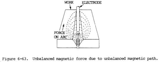 (1) Arc blow is caused by magnetic forces. The induced magnetic forces are not symmetrical about the magnetic field surrounding the path of the welding current. The location of magnetic material with respect to the arc creates a magnetic force on the arc which acts toward the easiest magnetic path and is independent of electrode polarity. The location of the easiest magnetic path changes constantly as welding progresses; therefore, the intensity and the direction of the force changes.