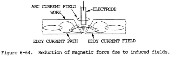 i. The use of alternating current for welding greatly reduces the magnitude of deflection or arc blow; however, ac welding does not completely eliminate arc blow. Reduction of arc blow is reduced because the alternating current sets up other currents that tend to either neutralize the magnetic field or greatly reduce its strength. Alternating current varies between maximum value of one polarity and the maximum value of the opposite polarity. The magnetic field surrounding the alternating current conductor does the same thing. The alternating magnetic field is a roving field which induces current in any conductor through which it passes, according to the induction principle. Currents are induced in nearby conductors in a direction opposite that of the inducing current. These induced currents are called eddy currents. They produce a magnetic field of their own which tends to neutralize the magnetic field of the arc current. These currents are alternating currents of the same frequency as the arc current and are in the part of the work nearest the arc. They always flow from the opposite direction as shown by figure 6-64. When alternating current is used for welding, eddy currents are induced in the workpiece, which produce magnetic fields and reduce the intensity of the field acting on the arc. Alternating current cannot be used for all welding applications and for this reason changing from direct current to alternating current may not always be possible to eliminate or reduce arc blow.