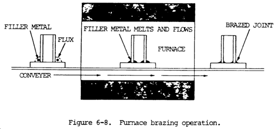 c. Furnace Brazing. In this process, a furnace produces the heat necessary for welding. In furnace brazing, the flame does not contact the workpiece. Furnace brazing is used extensively where the parts to be brazed can be assembled with the filler metal preplaced near or in the joint. brazing operation. Figure 6-8 illustrates a furnace