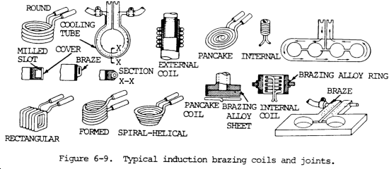 d. Induction Brazing. In this process, the workpiece acts as a short circuit in the flow of an induced high frequency electrical current. The heat is obtained from the resistance of the workpiece to the current. Once heated in this manner, brazing can begin. Three common sources of high frequency electric current used for induction brazing are the motor-generator, resonant spark gap, and vacuum tube oscillator. For induction brazing, the parts are placed in or near a water-cooled coil carrying alternating current. Careful design of the joint and the coil are required to assure the surfaces of all members of the joint reach the brazing temperature at the same time. Typical coil designs are shown in figure 6-9.
