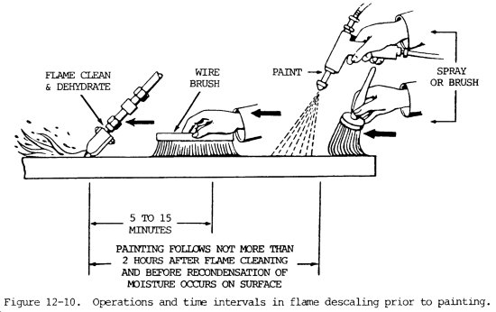 (1) Surfaces for metallizing must be clean. They also require roughening to ensure a good mechanical bond between the workpiece and coating. Grease, oil, and other contaminants are rearmed with any suitable solvent. Cast iron or other porous metals should be preheated at 500 to 800°F (260 to 427°C) to remove entrapped oil or other foreign matter. Sand blasting may be used to remove excessive carbon resulting from preheating cast iron. Chemical cleaning may be necessary prior to preheating.