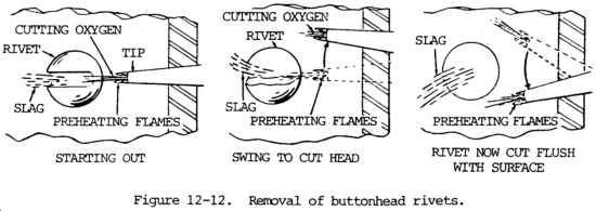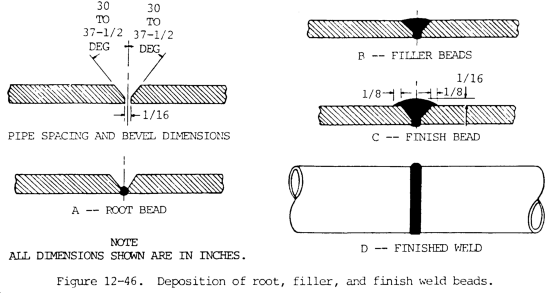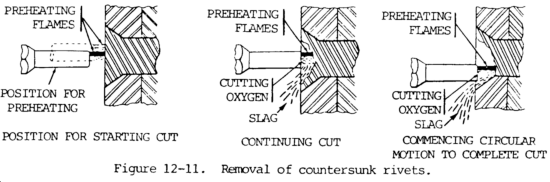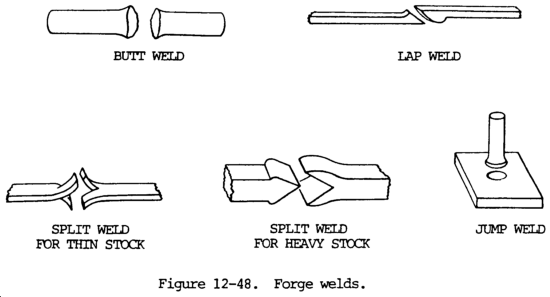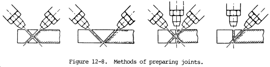 (3) In flash welding (B, fig. 12-51), the fusing of the parts is accomplished in three steps. The surfaces to be joined are brought together under light pressure, then separated slightly to allow arcing to occur. This small arc brings the metals to their melting points at the separated ends and, as a final operation, the molten surfaces are forced together under heavy pressure. As they meet, the molten metal and slag are thrown out and a clean fusion is obtained.