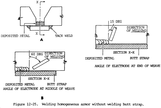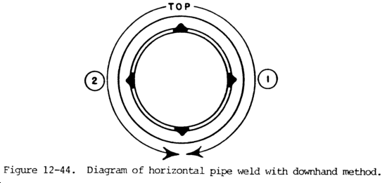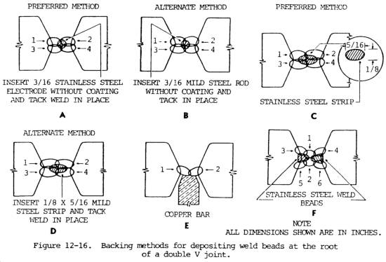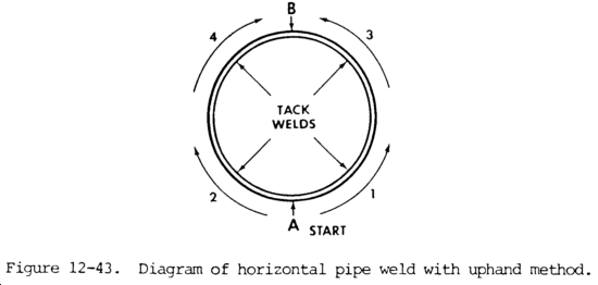 b. The welding techniques involve signaling the surface helper to close the knife switch when the welder begins. The bead technique is employed using the drag travel system. When the electrode is consumed, the welder signals "current off" to the helper who opens the knife switch. "Current on" is signaled when a new electrode is positioned against the work. The current must be connected only when the electrode is against the work.