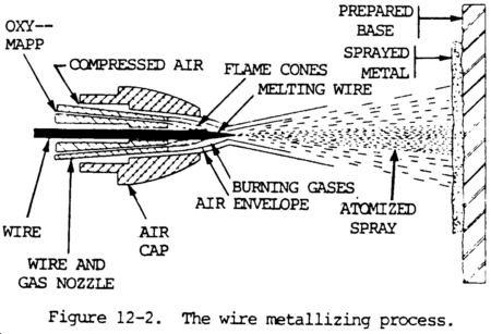 (1) Metallizing is used to spray metal coatings on fabricated workpieces. The coating metal initially is in wire or powder form. It is fed through a special gun and melted by an oxyfuel gas flame, then atomized by a blast of compressed air. The air and combustion gases transport the atomized molten metal onto a prepared surface, where the coating is formed (fig. 12-2).