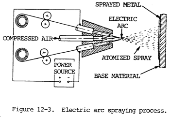 (d) Dry compressed air is used for atomizing and propelling the molten metal. A pressure of 80 psi (552 kPa) and from 30 to 80 cu ft/min (0.85 to 2.27 cu m/min) is used. Almost any metal that can be drawn into a wire can be sprayed. Following are metals that are arc sprayed: aluminum, babbitt, brass, bronze, copper, molybdenum, Monel, nickel, stainless steel, carbon steel, tin, and zinc.