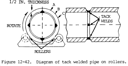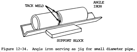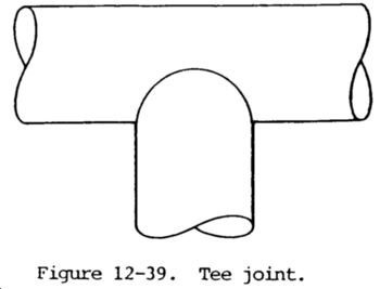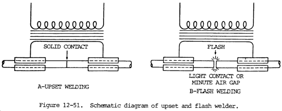 (2) In upset welding (A, fig. 12-51), the surfaces to be welded are brought into close contact under pressure. The welding heat is obtained from resistance to the flow of current through the area of contact of the abutting surfaces. When a sufficiently high temperature is obtained, welding of the surfaces is achieved by upsetting with the application of high pressure.