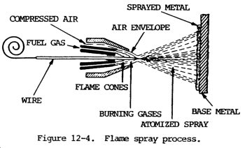 (c) Figure 12-4 shows the flame spray process using wire. The version that uses wires can spray metals that can be prepared in a wire form. The variation that uses powder has the ability to feed various materials. These include normal metal alloys, oxidation-resistant metals and alloys, and ceramics. It provides sprayed surfaces of many different characteristics.