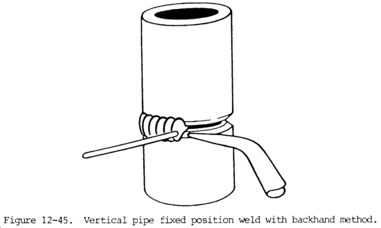 c. The procedure recommended for underwater welding is simply a touch technique. The electrode is held in light contact with the work so that the crucible formed by the coating at the end of the electrode acts as an arc spacer. To produce 1/2 in. (12.7 mm) of weld bead per 1.0 in. (25.4 mm) of electrode consumed in tee or lap joint welding, the electrode is held at approximately 45 degrees in the direction of travel and at an angle of about 45 degrees to the surface being welded. To increase or decrease weld size, the lead angle may be decreased or increased. The same procedure applies to welding in any position. No weaving or shipping is employed at any time. In vertical welding, working from the top down is recommended.