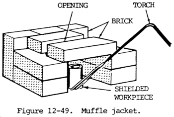 When using an oxyacetylene torch for heat, position the torch so that its flare will be completely within the muffle jacket. Do not allow the flame to be in direct contract with any particular portion of the workpiece. Have sufficient fuel available for 2 to 3 hours of operation at full flame. After the workpiece has been packed, shielded, and placed in the muffle jacket, ignite the torch, adjust the flame for maximum heat, and use additional brick to close about one half of the front opening of the jacket.