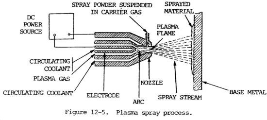 (a) Plasma spraying is a thermal spraying process which uses a nontransferred arc as a source of heat for melting and propelling the surfacing material to the workpiece. The process is shown in figure 12–5.