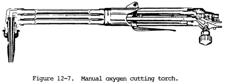 a. Torch. The torch used in underwater cutting is a fully insulated celluloid underwater cutting torch that utilizes the electric arc-oxygen cutting process using a tubular steel-covered, insulated, and waterproofed electrode. It utilizes the twist type collet for gripping the electrode and includes an oxygen valve lever and connections for attaching the welding lead and an oxygen hose. It is equipped to handle up to a 5/16-in. (7.9-mm) tubular electrode. In this process, the arc is struck normally and oxygen is fed through the electrode center hole to provide cutting. The same electrical connections mentioned above are employed.
