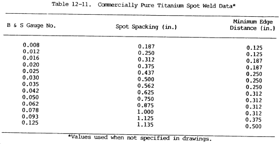 e. Specifications have been established for spot and seam welds in commercially pure titanium. The quality control measures of these specifications for stainless steel (MIL-W-6858) are used. Suitable minimum edge distances and spot spacing are listed in table 12-11. These are the same spot spacings and edge distances specified for spot welds in steel.