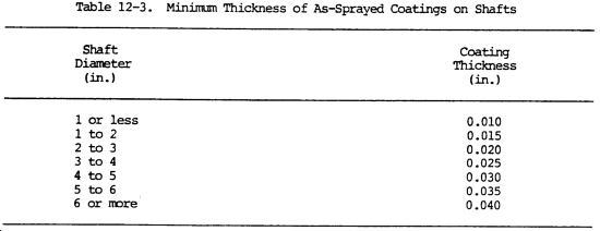 (2) The total thickness for the as-sprayed coating on shafts is determined by the maximum wear allowance, the minimum coating thickness that must be sprayed, and the amount of stock required for the finishing operation. The minimum thickness that must be sprayed depends on the diameter of the shaft and is given in table 12-3. For press-fit sections, regardless of diameter, a minimum of 0.005 in. (0.127 mm) of coating is required.