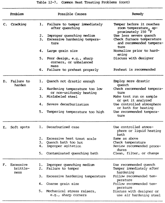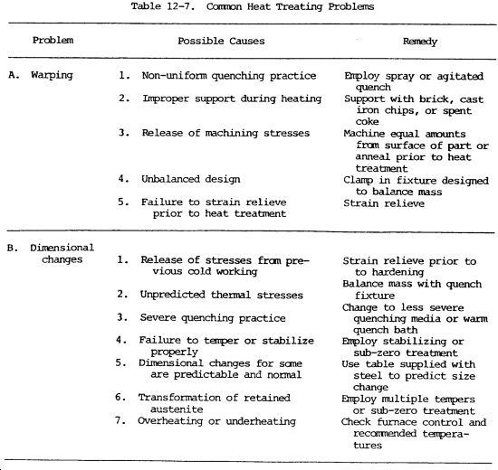 e. The must common problem related to heat treatment are warping, dimensional changes, cracking, failure to harden, soft spots, and excessive brittleness. The following table lists some problems, possible causes, and remedies.