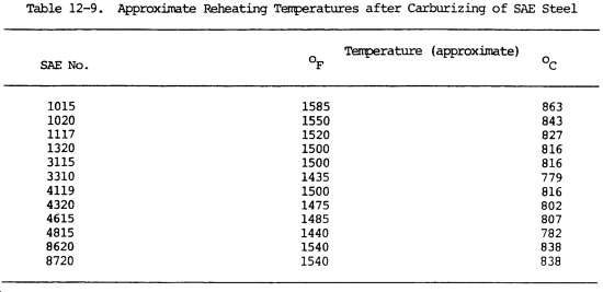 b. Drawing and Quenching SAE Steel. For the best grain structure in SAE steel workplaces, follow the procedure outlined in a. above, except reheat the SAE steel to the temperature shown in table 12-9 before quenching. The workpiece is tempered after quenching. This method is generally used when the case hardening penetration is from 1/25 to 3/50 in. (1.0 to 1.5 mm).